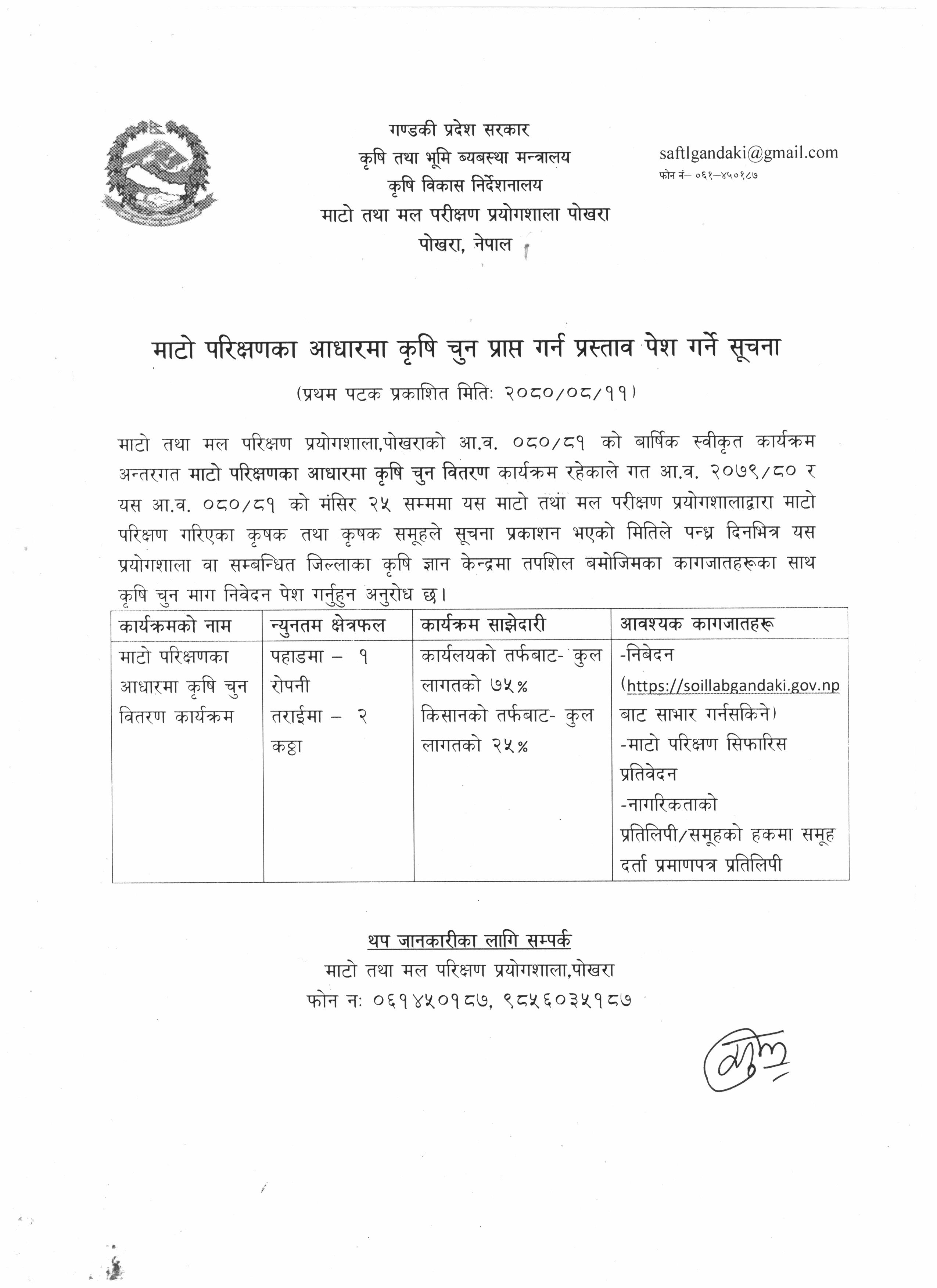 माटो परीक्षणका आधारमा कृषि चून वितरणका लागी प्रस्ताव आहवाणको लागी निवेदन 2080-08-11